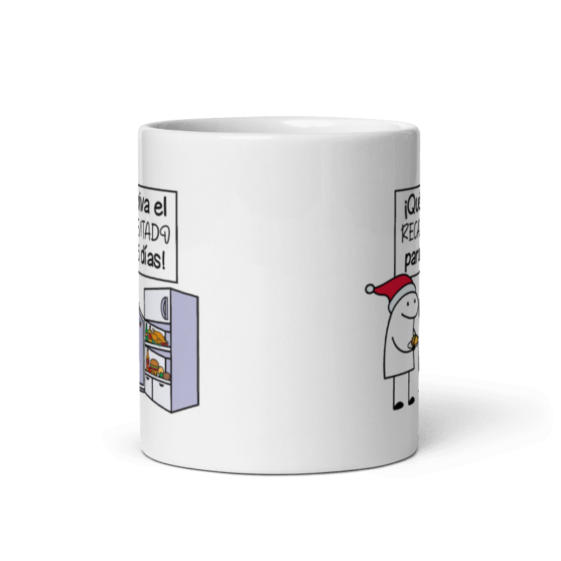 Taza navideña "Que Viva el Recalentado" de cerámica premium con ilustración cartoon plana y divertida.